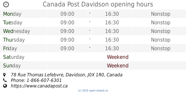 It is also possible to : Edit these OPENING HOURS of Branch Canada Post In Davidson, 78 Rue Thomas Lefebvre,